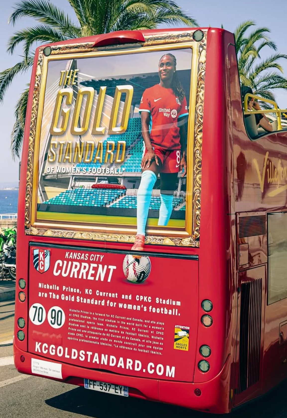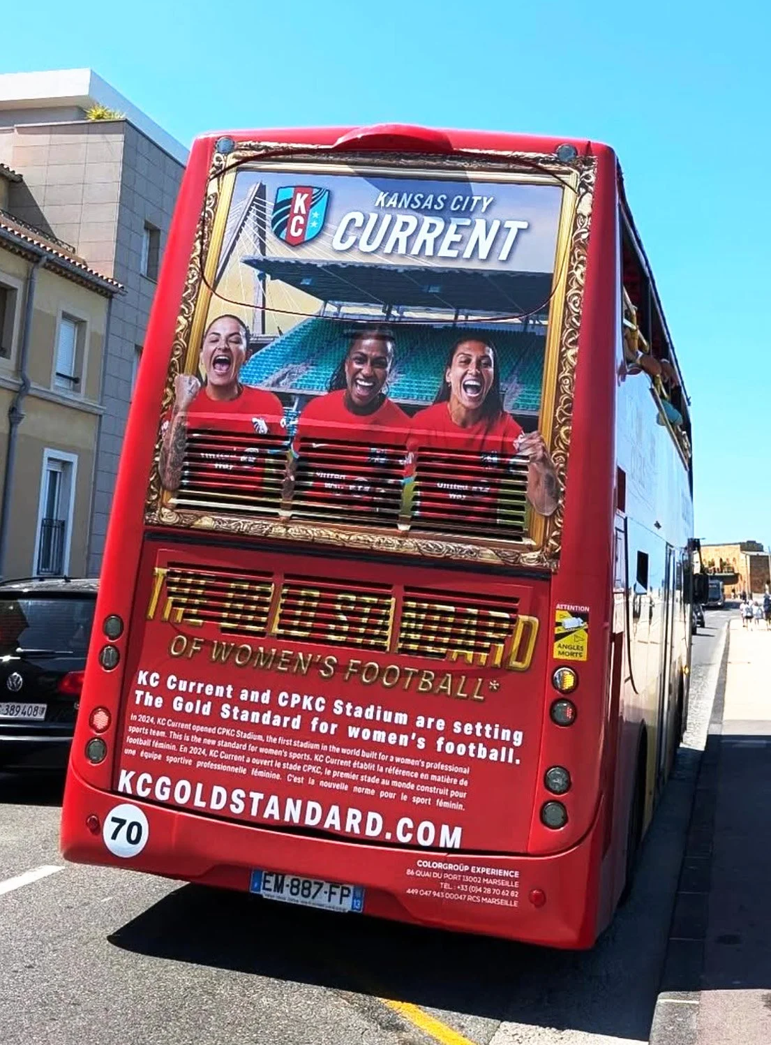 During the 2024 Paris Olympics, the KC Current sought to promote their players participating in the games. Four cities were chosen, all hosts of the Women’s Soccer event: Lyon, Nice, Marseille and Bordeaux. Double decker tour busses in each city would have a branded vinyl wrap applied to the rear section.