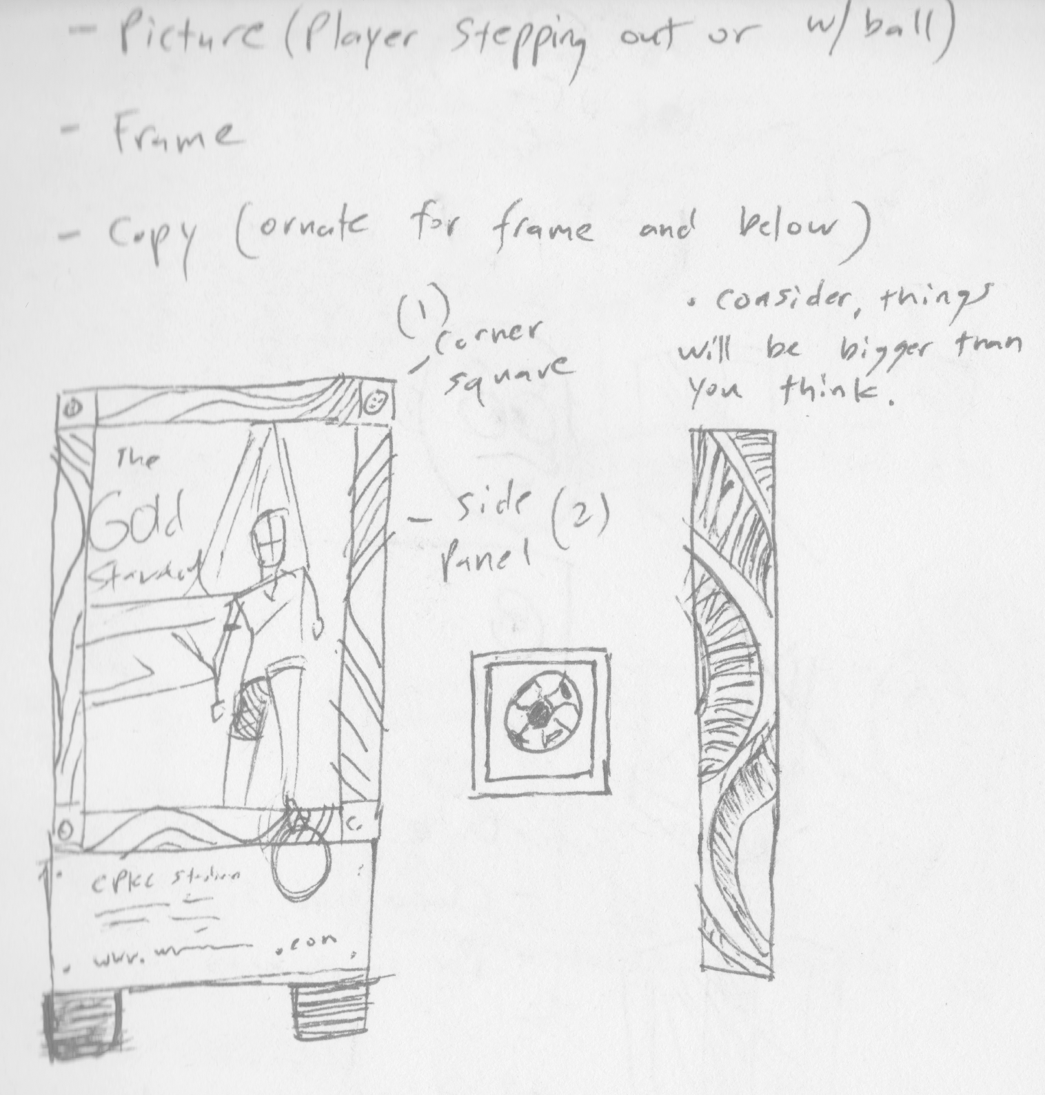 Initial sketches to visualize the a player stepping out of a painting or art frame and onto the street. It is a connection to the rich artistic history of France as well as a nod to the gold medals of the Olympic games.