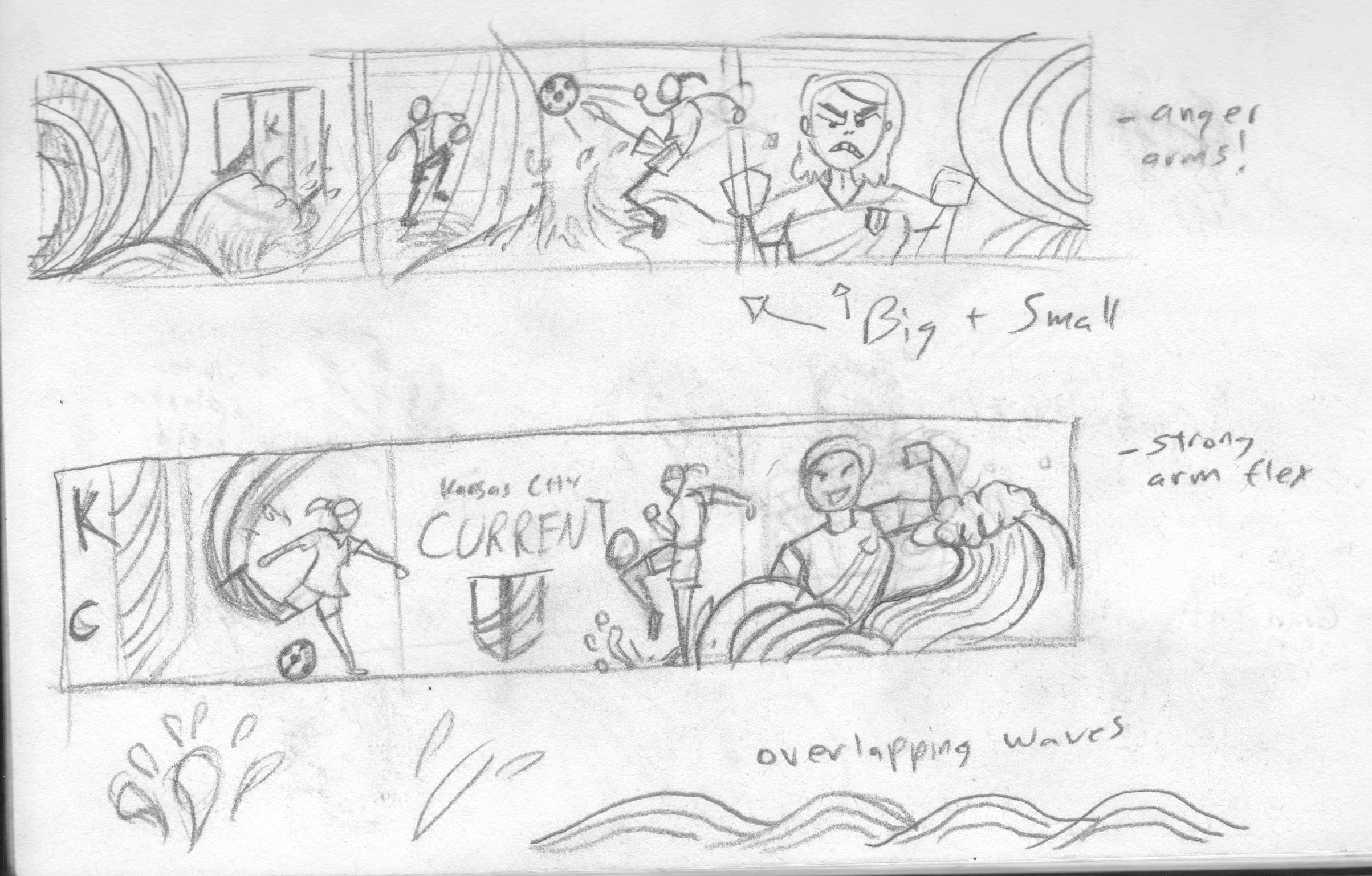 During the concept phase, I drew from the club’s strong association with water and the energy of rivers. Player imagery was also a key element of the design. Initial sketches explored the idea of combining action photos with graphic elements.