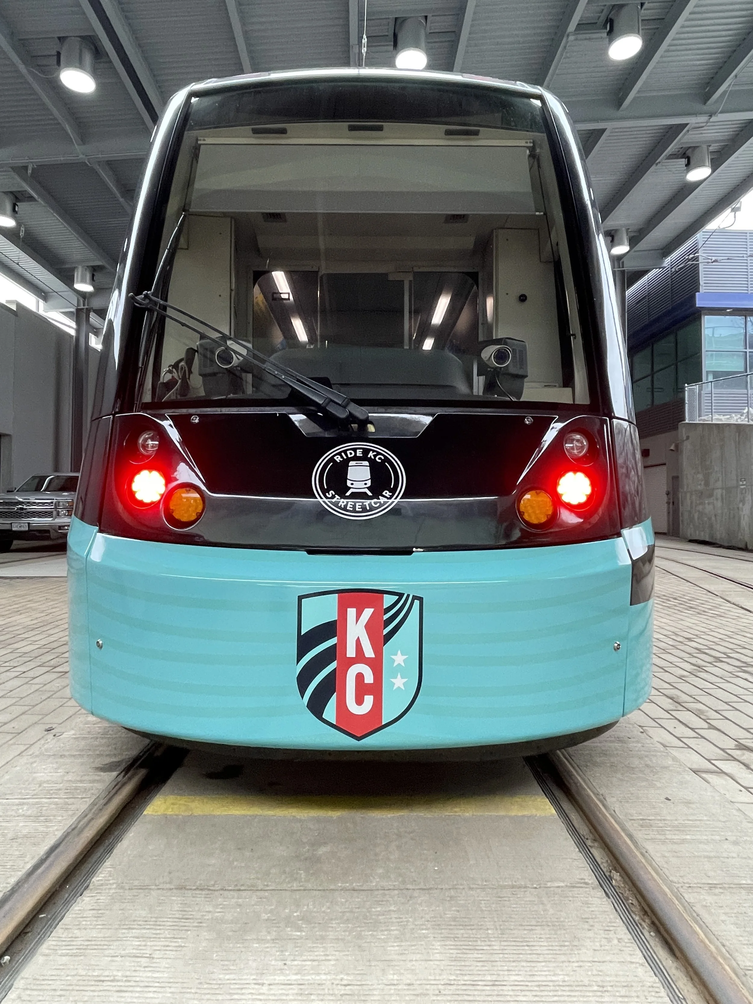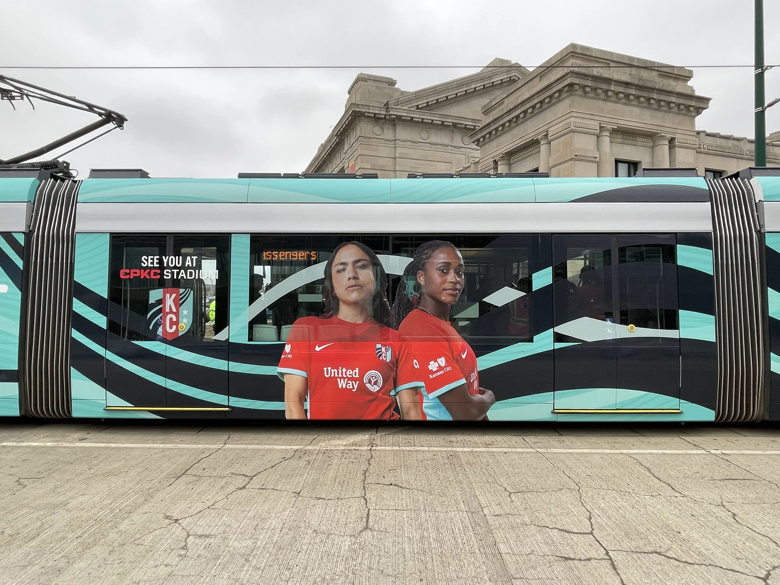 To kick off their third season, the Current collaborated with the KC Streetcar for a branded vinyl wrap. This design was to promote the team as well as the new CPKC stadium. In addition to the streetcar wrap, I created designs for the stops along it’s service route.